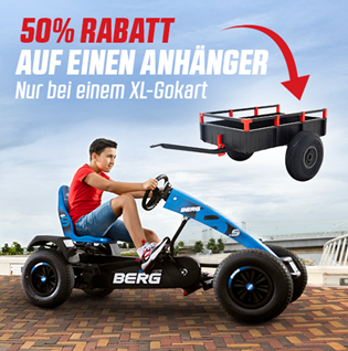 Beim Kauf eines BERG Go-Karts aus der XL BFR- oder XXL BFR-Serie erhältst Du 50 % Rabatt auf einen passenden Anhänger (Artikelnummern: 18.08.00.00, 18.08.02.00 oder 18.08.04.00).