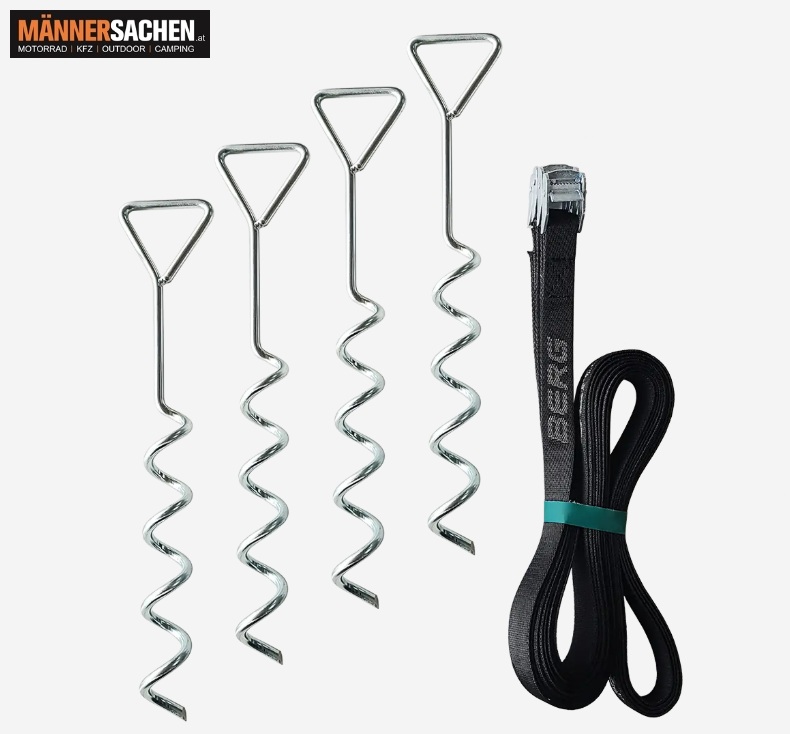 Dieses Set enthält robuste Heringe und starke Gurte, um deinen Trampolinrahmen fest im Boden zu verankern. Ziemlich praktisch, wenn der Wind stark bläst.