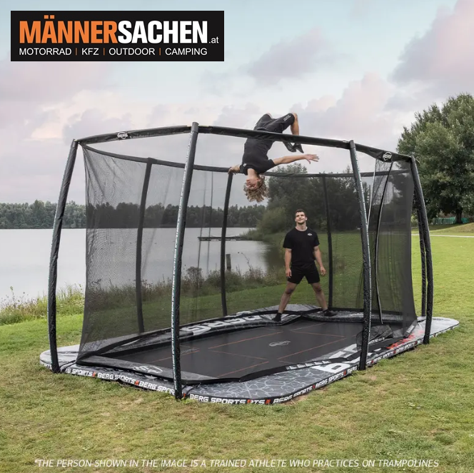 Das BERG SPORTS Ultim Pro Bouncer FlatGround 500 + Safety Net XL ist ein hochwertiges, rechteckiges Trampolin mit den Maßen 500 x 300 cm.