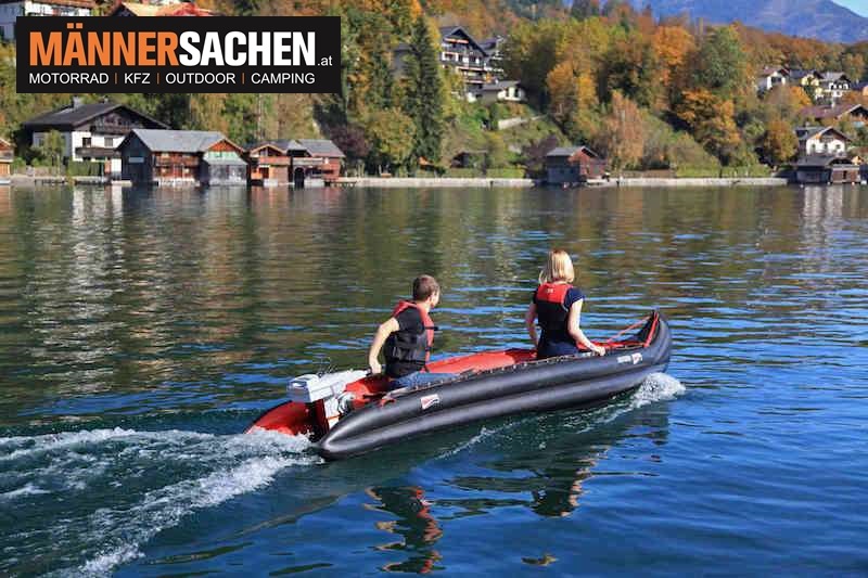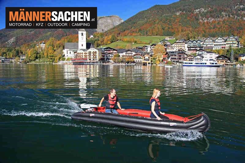 Mit 6 PS Antrieb verwandelt es sich zum schnittigen Motorboot mit Gleitgeschwindigkeiten bis 25 km/h.