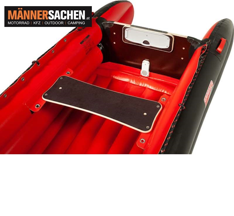Hohe Seitenwände schützen bei Wellenschlag und bewahren Kinder vor dem Herausfallen; der große Innenraum mit breitem Heckbereich nimmt Zuladung gut auf. Bis zu 3 Sitzbretter für 3 Erwachsene können einzeln in drei Positionen getrimmt werden, an den freien seitlichen Ösen lässt sich Gepäck befestigen.