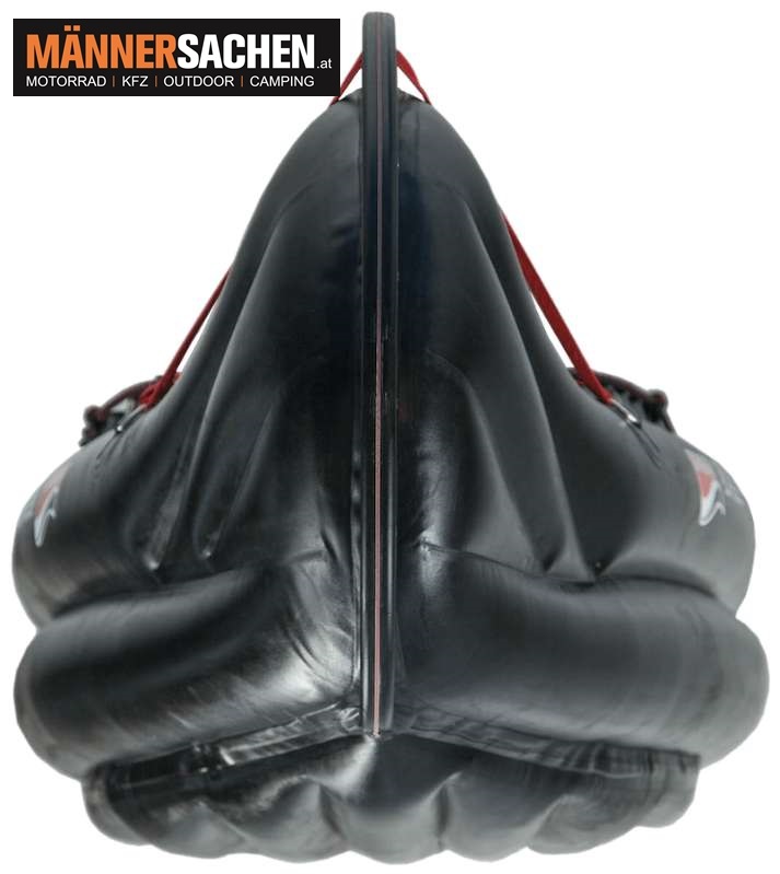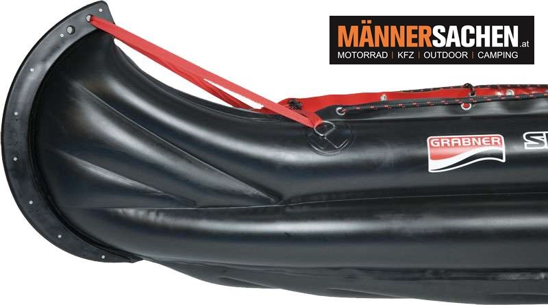 Eine kräftige Bugleiste schützt die Bootshaut beim Anprallen. An dem Gurt kann das Boot getragen und Gepäck fixiert werden, zudem erleichtert er das Festhalten nach einer Kenterung.