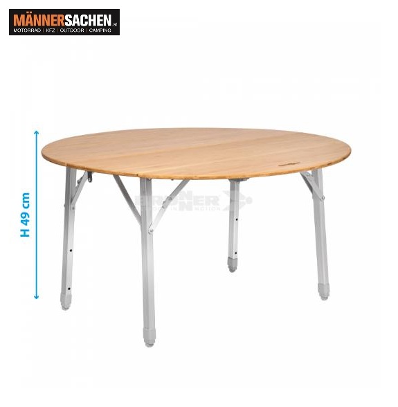 Runder Outdoor- und Campingtisch mit 4-fach klappbarer Tischplatte aus elegantem Bambusholz und höhenverstellbarem Gestell aus Aluminium.