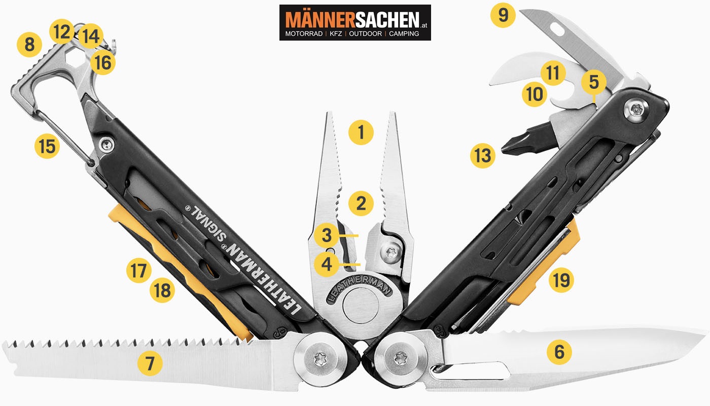 Unser Tool speziell für den Outdoor-Einsatz. Neben einer Einhandklinge und einer Signalpfeife, enthält dieses Multi-Tool zusätzlich einen Feuerstarter und einen Hammer.