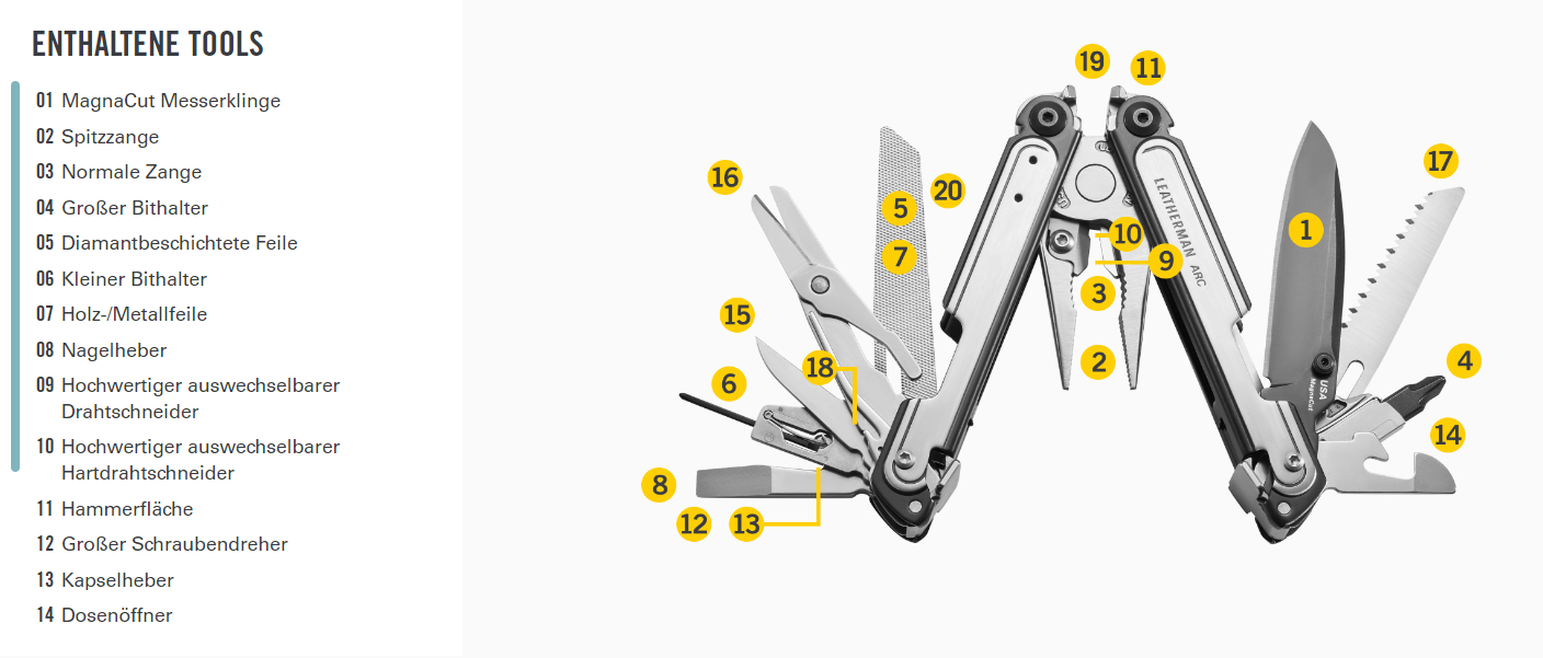 Mit 20 Werkzeugen, einem abnehmbaren Taschenclip, einem Nylon-Holster mit vier Taschen und acht doppelseitigen Bits setzt das robuste, praktische ARC® einen neuen Standard für Premium-Multi-Tools.