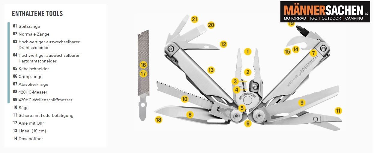 LEATHERMAN SIGNAL  Holster: Nylon Sheath Unser Tool speziell für den Outdoor-Einsatz. Neben einer Einhandklinge und einer Signalpfeife, enthält dieses Multi-Tool zusätzlich einen Feuerstarter und einen Hammer. Erhältliche Farbe: Braun Coyote, Schwarz und Edelstahl, Guava, Grün, Aqua/Stainless, Santa Fe, Nocturnal, Mesa Verde, Tundrascape   • Feststellbare Werkzeuge: Alle Funktionen (mit Ausnahme der Zange) rasten ein, sodass Du die Tools sicher und effektiv verwenden kannst. • Abnehmbarer Taschenclip: Entferne diesen Taschenclip nach Belieben. • Außenliegende Funktionen: Dieses Multi-Tool verfügt über Tools, die zugänglich bleiben, auch wenn das Tool verriegelt oder geschlossen ist. • Mit einer Hand bedienbar : Halte eine Hand frei. Öffne und verwende die Funktionen dieses Tools mit einer Hand.   Enthaltene Werkzeuge 01 Spitzzange 02 Normale Zange 03 Hochwertiger auswechselbarer Drahtschneider 04 Hochwertiger auswechselbarer Hartdrahtschneider 05 Abisolierklinge 06 420HC-Kombimesser 07 Säge 08 Hammer 09 Ahle mit Öhr 10 Dosenöffner 11 Kapselheber 12 1/4-Zoll-Sechskant-Bithalter 13 Bithalter 14 1/4"-Ringschlüssel 15 Karabiner   Technische Daten • GEWICHT: 7.5 oz. | 212.6 g. • GESCHLOSSENE LÄNGE: 4.5 in. | 11.43 cm. • GEÖFFNETE LÄNGE: 6.75 in. | 17.14 cm. • KLINGENLÄNGE: 2.73 in. | 6.93 cm. • BREITE: 1.5 in. | 3.8 cm. • GESAMTDICKE: .63 in. | 1.6 cm. • ENTHÄLT: Signalpfeife, Cereisen Stab, Diamantschärfer • MATERIALIEN: 420HC-Edelstahl, 440C-Edelstahl, DLC-Beschichtung, Cerakote® • ENTHALTENE BITS: #1-2 & 3/16" Kreuzschlitz-Schraubendreher   Bei weiteren Fragen stehen wir Ihnen gerne telefonisch oder per Mail zur Verfügung. 0676 - 911 999 0  office@maennersachen.at