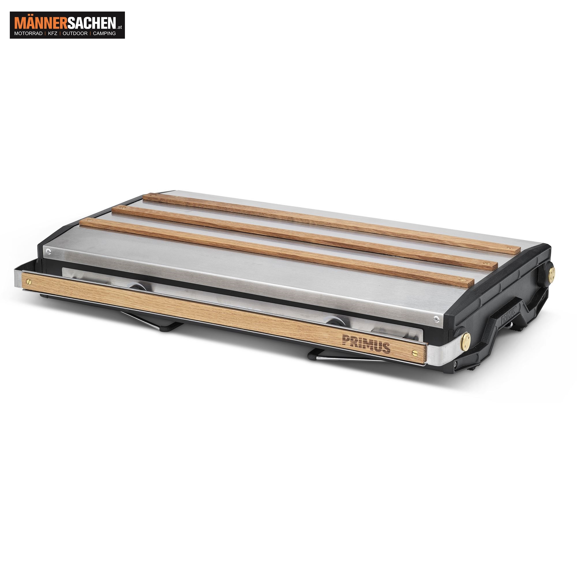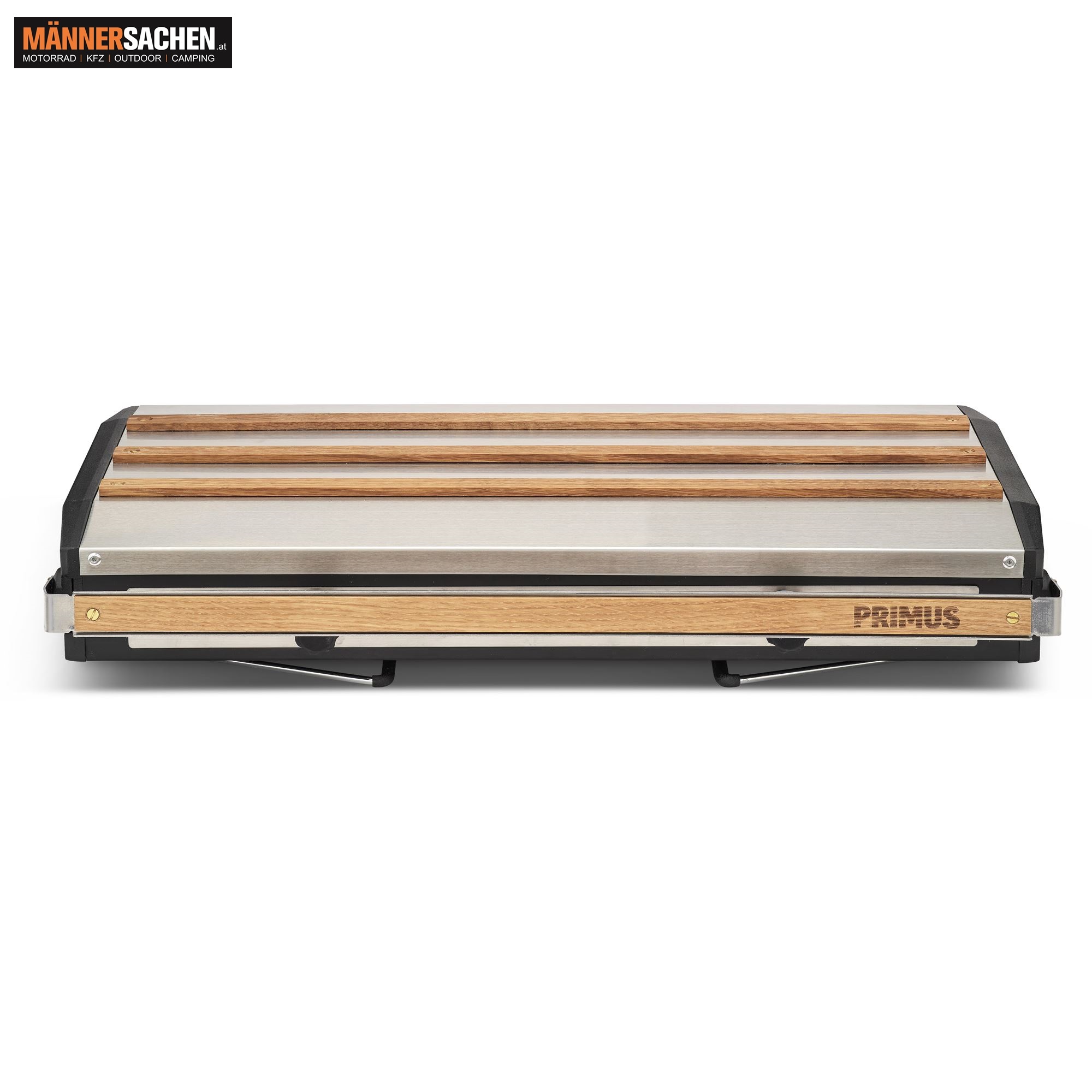 Der Deckel und die zusätzlichen Windschutzblenden. Der Kocher verfügt über eine Grillplatte mit Antihaftbeschichtung, die einfach zu verwenden und problemlos zu reinigen ist.