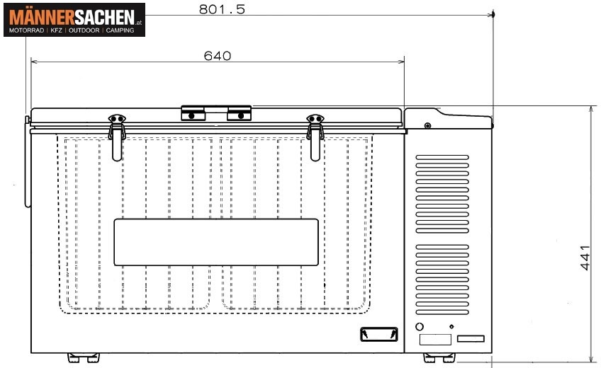 Außenmaße: B x H x T 790 x 441 x 490 mm ( ohne Griff ) ( Breite mit Handgriffen: +2x 40 mm )