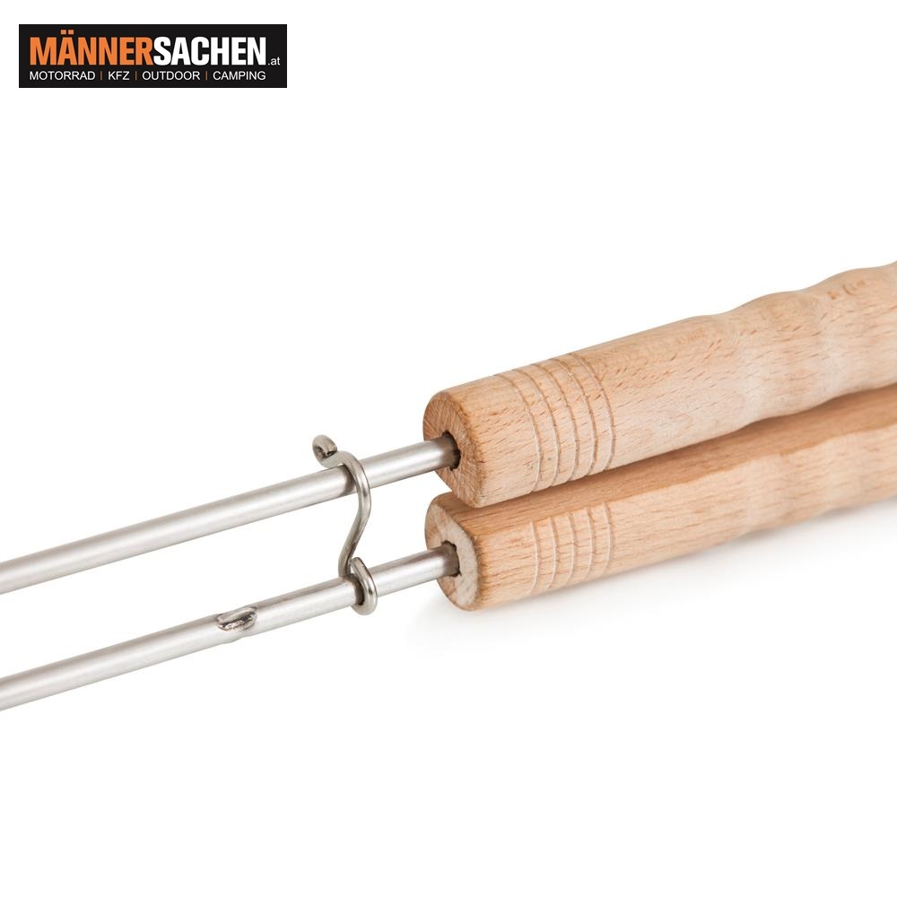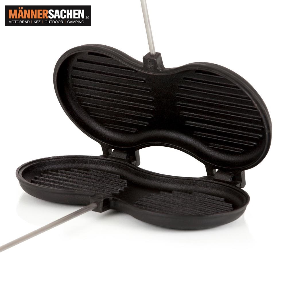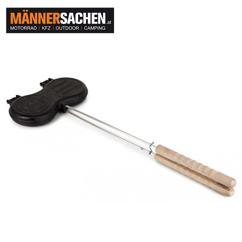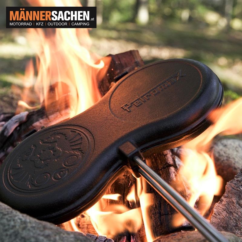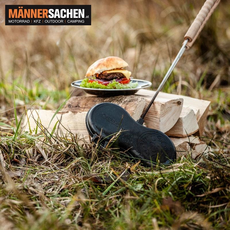 Mit dem Petromax Burgereisen kannst du in den runden Formen mit je zwölf Zentimetern Durchmesser perfekte Burger braten. Dank der gerillten Oberfläche bekommen sie das typische Grillmuster. Durch die wärmespeichernden Eigenschaften der gusseisernen Form werden die Burger im Feuer scharf angebraten und können anschließend mit der Resthitze perfekt gegart werden. Dank der abgeflachten, aufliegenden Holzgriffe und des Verschlusshakens kannst du das Burgereisen sicher verschließen und in die Glut halten. Zum Reinigen kannst du die beiden Formen über das Scharnier einfach voneinander trennen und einzeln säubern. Für das problemlose Entfernen von Bratrückständen in der Grillstruktur empfehlen wir dir den Petromax Schaber mit Rillen für Gusseisen.