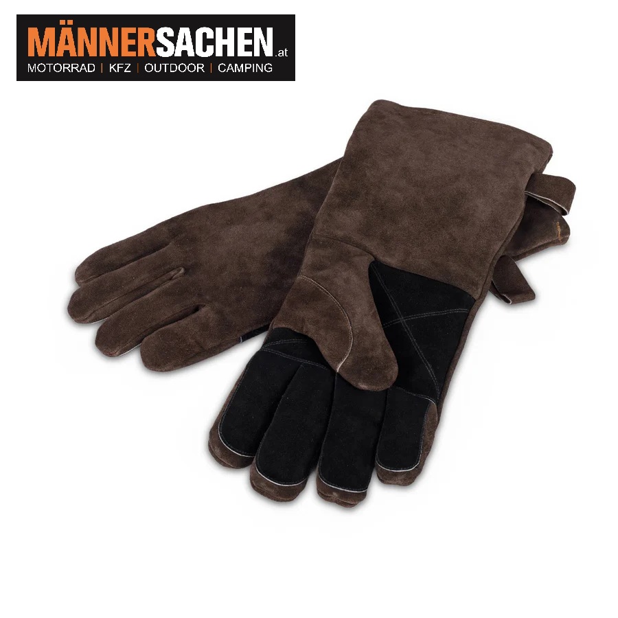 Grillhandschuhe aus dunkelbraunem Rauleder und komfortablem Vlies, die bis zu 250°C standhalten.