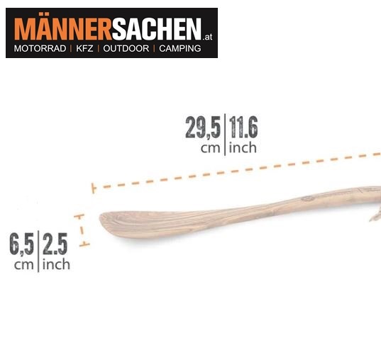 Das Olivenholz-Material schützt die Patina und ermöglicht einfaches Ablösen und Servieren. Nach dem Kochen kann der Pfannenwender am Lederriemen aufgehängt oder am Rucksack mitgenommen werden.
