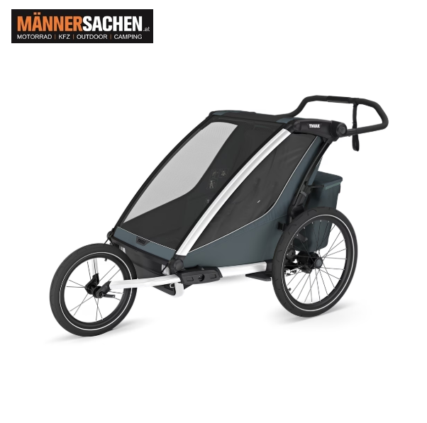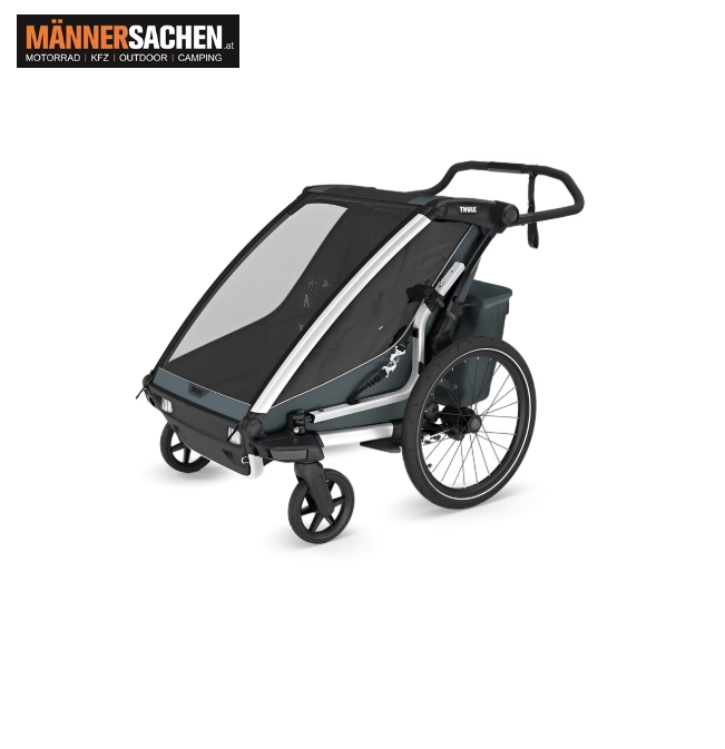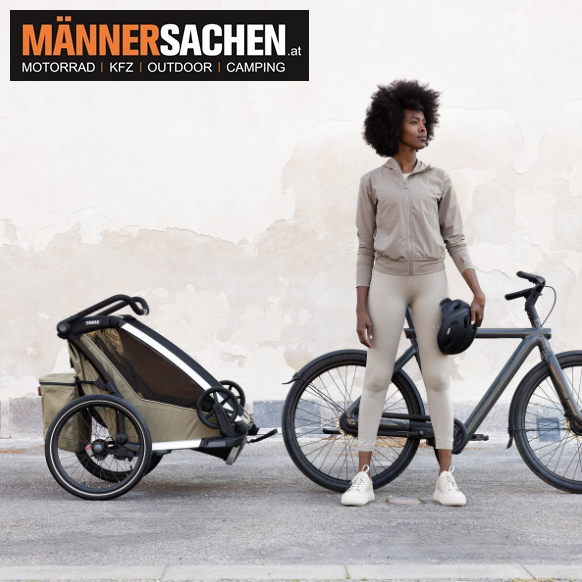 THULE Chariot Cross 2 single Multisport-Fahrradanhänger Einsitzer erhältliche Farben: Faded Khaki (10201036) oder Dark Slate (10201034) Der benutzerfreundliche Fahrradanhänger und Kinderwagen für alltägliche Fahrten und Wochenendabenteuer. Klicken Sie HIER, um ein Video des Chariot Cross 2 zu sehen! - Für Deine Aktivitäten entwickelt 4 Aktivitäten – speziell entwickelt zum Radfahren, Joggen, Spazieren und Skifahren (Jogging- und Skisets separat erhältlich). Das mitgelieferte Regenverdeck und die Sonnenblende halten Dein Kind trocken und schützen es vor der Sonne. - Vollständig gepolsterter Liegesitz Praktische, mit einer Hand einstellbare Liegeposition und vollständig gepolsterter Sitz für ein Nickerchen unterwegs - Einfach von einer Aktivität zur anderen wechseln Das neu gestaltete FlipWing-System ermöglicht einen noch einfacheren Wechsel zwischen Radfahren und Spazieren, da die Räder jetzt nach oben und unten geklappt werden können, während der Anhänger am Fahrrad befestigt ist - Befestigung der Deichsel mit einer Hand Mit der neuen Deichsel kann der Anhänger einfach und sicher mit einer Hand am Fahrrad befestigt und wieder abmontiert werden - Einstellbare Federung Einstellbare Federung, damit Du den Komfort der Fahrt individuell anpassen kannst, wenn Dein Kind wächst oder Du schwere Gegenstände im Anhänger transportierst - XL-Gepäckstauraum Großer Gepäckkorb mit Reißverschluss zur sicheren Aufbewahrung von Gegenständen, der für mehr Beinfreiheit beim Joggen verstaut werden kann - Kompakt zusammenklappbar Dank des kompakten und benutzerfreundlichen Klappmechanismus lässt sich das Produkt einfacher denn je transportieren - Gute Sichtbarkeit Thule Delight Rückleuchte für erhöhte Sichtbarkeit und Sicherheit im Lieferumfang enthalten - Hervorragende Belüftung Lüftungsschlitze sorgen für einen optimalen Luftstrom und Klimatisierung, abnehmbare Klemmen sorgen für mehr Belüftung bei Verwendung eines Regenverdecks. - Praktische Aufbewahrung Die Thule Click n’ Store bietet eine praktische Aufbewahrung der Spazier-, Jogging- und Radfahrsets am Kinderwagen, während eine andere Aktivität ausgeführt wird - Einfache Pflege Die komfortablen gepolsterten Sitze sind abnehmbar und leicht zu reinigen   Technische Daten Maximales Gewicht des Kindes: 22 kg Maximale Tragkraft des Kindertransporters: 34 kg Maße zusammengeklappt: 86.3 x 63.3 x 37.5 cm Gewicht: 14.2 kg Schulterbreite: 40.5 cm Sitzhöhe: 64 cm Kompatible Türbreite: 65.1 cm Sicherheitsgurt: 5-Punkt Erfüllt die Sicherheitsnormen Kinder: 1   Bei Fragen einfach anrufen oder ein E-Mail schreiben! 0676 9119990 oder  office@maennersachen.at