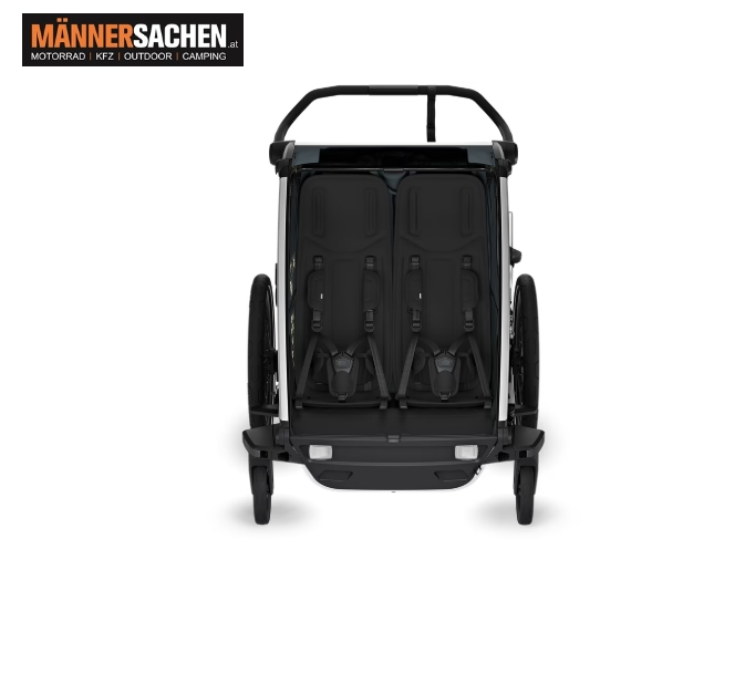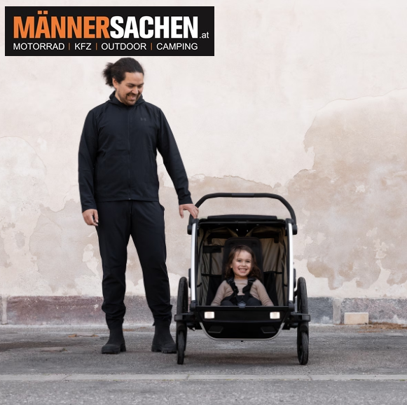 EINMALIGE SONDERAKTION!!! NUR SOLANGE DER VORRAT REICHT!!! Farben: schwarz (10201031) oder natural gold (10201033) Klicken Sie HIER, um ein Video des Chariot Sport 2 zu sehen! Der modulare Fahrradanhänger und Jogging-Kinderwagen in einem – für das Training in allen Jahreszeiten sowie mühelose alltägliche Fahrten. Eigenschaften - Für Deine Aktivitäten entwickelt 4 Aktivitäten – speziell entwickelt zum Radfahren, Joggen, Spazieren und Skifahren (Jogging- und Skisets separat erhältlich). Das mitgelieferte Regenverdeck und die Sonnenblende halten Dein Kind trocken und schützen es vor der Sonne. - Modernes Design mit hochsichtbarer LED-Beleuchtung Integriertes LED-Licht, betrieben durch die Thule Powerbank 10k (separat erhältlich) für bessere Sichtbarkeit unter allen Bedingungen - Per Handhebel zu bedienende Scheibenbremsen Für mehr Kontrolle in steilem Gelände und beim Laufen - Vollständig gepolsterter, modularer Liegesitz Dank der modularen Sitzmöglichkeiten kannst Du wählen, ob ein Kind in der Mitte oder zwei Kinder auf beiden Seiten des Anhängers sitzen sollen. Praktische, mit einer Hand einstellbare Liegeposition und vollständig gepolsterte Sitze für ein Nickerchen unterwegs. - Einfach von einer Aktivität zur anderen wechseln Das neu gestaltete FlipWing-System ermöglicht einen noch einfacheren Wechsel zwischen Radfahren und Spazieren, da die Räder jetzt nach oben und unten geklappt werden können, während der Anhänger am Fahrrad befestigt ist - Befestigung der Deichsel mit einer Hand Mit der neuen Deichsel kann der Anhänger einfach und sicher mit einer Hand am Fahrrad befestigt und wieder abmontiert werden - Einstellbare Federung Einstellbare Federung, damit Du den Komfort der Fahrt individuell anpassen kannst, wenn Dein Kind wächst oder Du schwere Gegenstände im Anhänger transportierst - XL-Gepäckstauraum Großer Gepäckkorb mit Reißverschluss zur sicheren Aufbewahrung von Gegenständen, der für mehr Beinfreiheit beim Joggen verstaut werden kann - Kompakt zusammenklappbar Dank des kompakten und benutzerfreundlichen Klappmechanismus lässt sich das Produkt einfacher denn je transportieren - Klimatisierter Innenraum Klimatisierter Innenraum mit herausnehmbaren Fenstern und mehrfach verstellbarer Sonnenblende. Belüftungsöffnungen sorgen für eine optimale Luftzirkulation und Klimaregulierung, abnehmbare Klemmen sorgen für mehr Belüftung bei Verwendung eines Regenverdecks - Praktische Aufbewahrung Die Thule Click n’ Store bietet eine praktische Aufbewahrung der Spazier-, Jogging- und Radfahrsets am Kinderwagen, während eine andere Aktivität ausgeführt wird - Einfache Pflege Die komfortablen gepolsterten Sitze sind abnehmbar und leicht zu reinigen    Technische Daten Maximales Gewicht des Kindes: 2x22 kg Maximale Tragkraft des Kindertransporters: 42 kg Maße zusammengeklappt: 86.3 x 77.3 x 37.5 cm Gewicht: 17.7 kg Schulterbreite: 55.5 cm Sitzhöhe: 64 cm Kompatible Türbreite: 80 cm Sicherheitsgurt: 5-Punkt Erfüllt die Sicherheitsnormen Kinder: 1 oder 2    Bei Fragen einfach anrufen oder ein E-Mail schreiben! 0676 9119990 oder  office@maennersachen.at