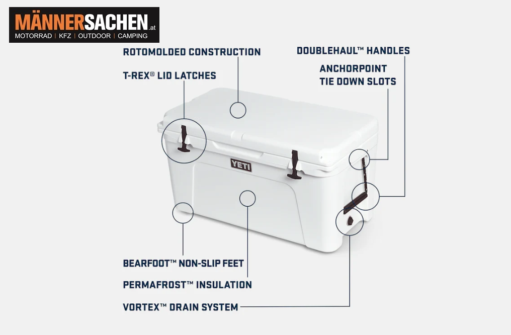 YETI Tundra® 65 Kühlbox Leergewicht: 13,7 kg  Außenabmessungen: 78.2W X 43.9D X 40.6H CM Versorgt ein Campingwochenende für vier Personen, dient nebenbei als Angelplattform und bleibt innen kalt, wenn außen extreme Hitze herrscht. • Platz für 77 Dosen • Platz für 26,3 kg Eis • Umfasst einen herausnehmbaren Einlegekorb   Versorgt ein Campingwochenende für vier Personen, dient nebenbei als Angelplattform und bleibt innen kalt, wenn außen eine Affenhitze herrscht. Unserer Ansicht nach ist die Tundra® unsere vielseitigste Kühlbox. Sie hält deine Beute genauso kalt wie die Getränke und Lebensmittel für deinen Grillabend im Garten. Sie ist an der Anlegestelle genauso zu Hause wie auf der Ranch oder im Tarnzelt. Darüber hinaus ist diese Kühlbox sehr geräumig und kann Rotbarsche oder deine wertvolle Rinderbrust verstauen, ohne ins Schwitzen zu geraten.   Robust gebaut • ROTATIONSGEFORMTE KONSTRUKTION für praktisch unzerstörbaren Schutz. • Die T-REX® DECKELVERSCHLÜSSE sind extrem belastbar, patentiert und so gefertigt, dass sie nicht kaputtgehen. • Das NEVERFAIL™ SCHARNIERSYSTEM: zwei Scharnierstifte und eine ineinandergreifende Konstruktion verhindern, dass das Scharnier jemals bricht. • BÄRENBESTÄNDIGES DESIGN vom Interagency Grizzly Bear Committee (IGBC) bestätigt, wenn sie mit Master Lock® Vorhängeschlössern mit extra langem Bügel gesichert sind.   Legendäre Leistung • Das FATWALL™ DESIGN bietet bis zu acht Zentimeter an Isolierung. • Die PERMAFROST™ ISOLIERUNG aus druckgespritztem Polyurethan hält die gerade eingefüllte Temperatur. • Das INTERLOCK™ DECKELSYSTEM erzeugt eine formschlüssige Barriere gegen extreme Temperaturen. • Die COLDLOCK™ DICHTUNG: Eine Dichtung in Gefrierschrankqualität, die Wärme draußen und Kälte drinnen hält.   Für den täglichen Gebrauch • DOUBLEHAUL™ GRIFFE aus Polyesterseilen in Militärqualität. • LIPGRIP™ GRIFFE: Sind niemals im Weg und erleichtern das Tragen deiner Beute. • RUTSCHFESTE BEARFOOT™ FÜSSE verhindern ein Rutschen im Boot oder auf dem Rücksitz. • ANCHORPOINT™ VERRZURRSCHLITZE erleichtern die Befestigung im Boot, Anhänger oder auf der Ladefläche.   Smart Design • VORTEX™ ABLAUFSYSTEM: auslaufsicher, robust und für schnelles und einfaches Ablassen konzipiert.   Bei weiteren Fragen stehen wir Ihnen gerne telefonisch oder per Mail zur Verfügung. 0676 - 9119990  office@maennersachen.at