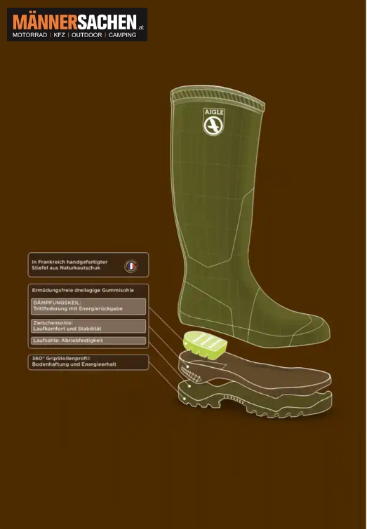 Pflege: Reinigen Sie Ihre Gummistiefel nach jeder Verwendung mit Seifenwasser und einem Schwamm und lassen Sie sie an der frischen Luft trocknen. Stellen Sie die Stiefel nicht zum Trocknen neben eine Wärmequelle oder in die Sonne. Bewahren Sie die Stiefel kühl und trocken und vor Sonne geschützt gerade stehend auf, zum Beispiel mit einem Schuhspanner. Verwenden Sie vierteljährlich ein Gummistiefelspray (z.B. AIGLE Swipol), um Ihre Stiefel zu schützen und die Kautschukqualitäten wiederzubeleben.