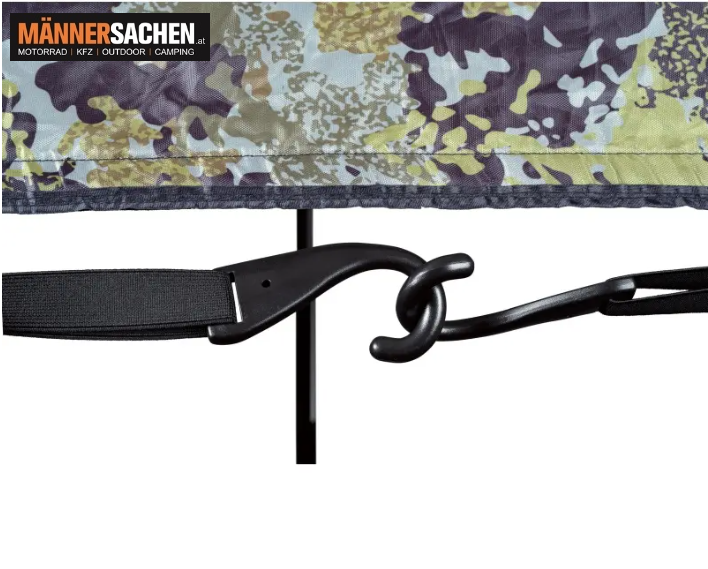 Zuverlässige Befestigung: Erdsporne und Gummibänder fixieren den Schirm sicher am Baum oder Bock.