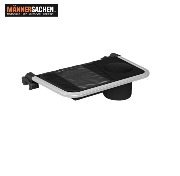 Lenker-Organizer mit Reißverschlusstasche und integriertem Becherhalter.