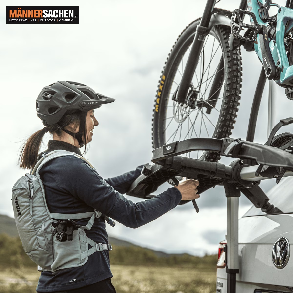 - Einfache Befestigung der Fahrräder mit verstellbaren/abnehmbaren Fahrradhaltearmen und Thule AcuTight Drehmomentbegrenzer-Knöpfen, die klicken, wenn das optimale Drehmoment erreicht ist