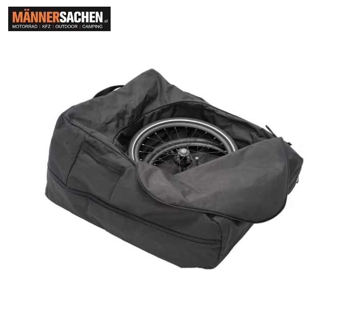Schützende Transporttasche mit separater Aufbewahrungstasche für Räder innen.